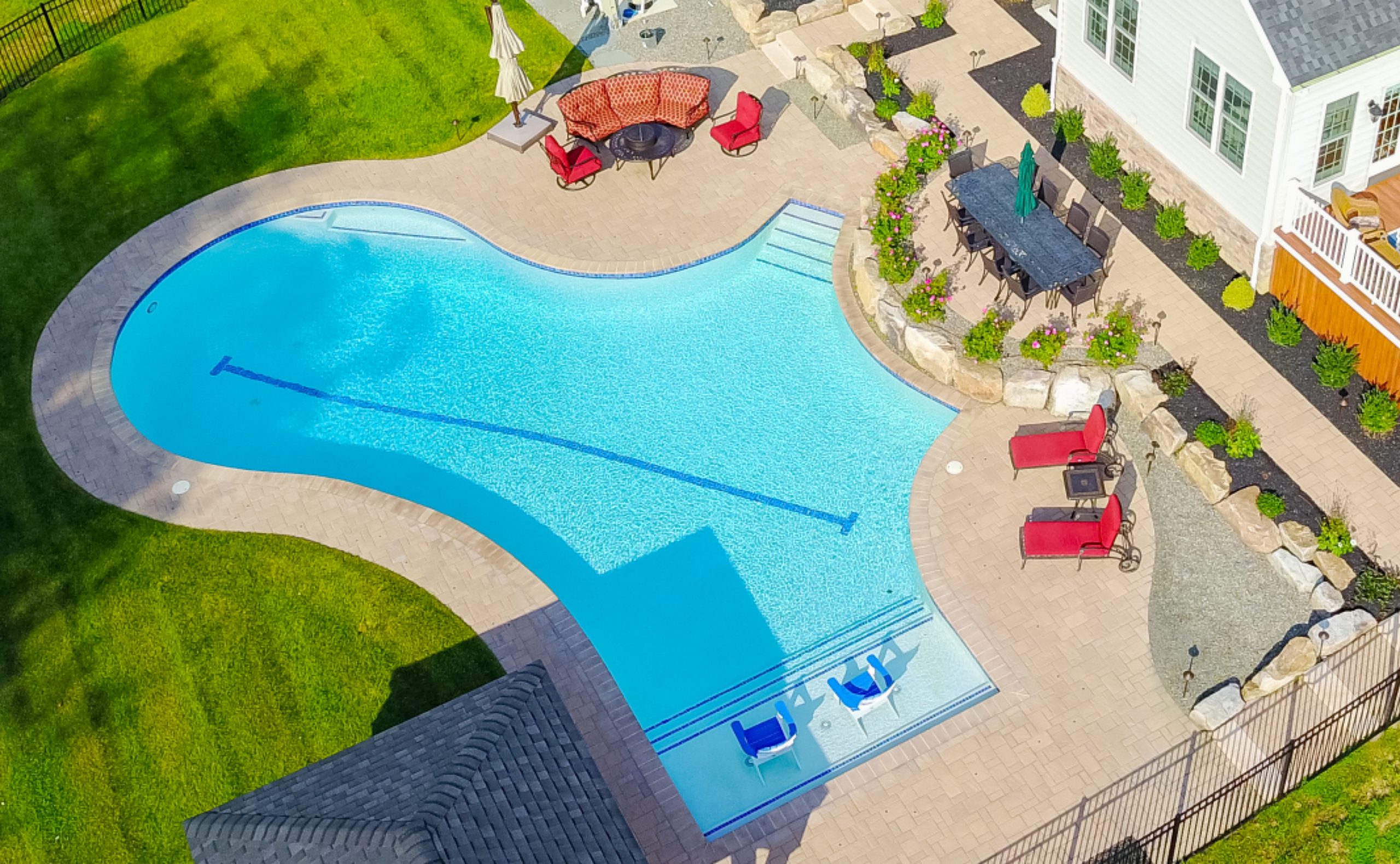 A single line helps us get physical, turning this informal curvilinear pool into a swimmer’s lap lane.